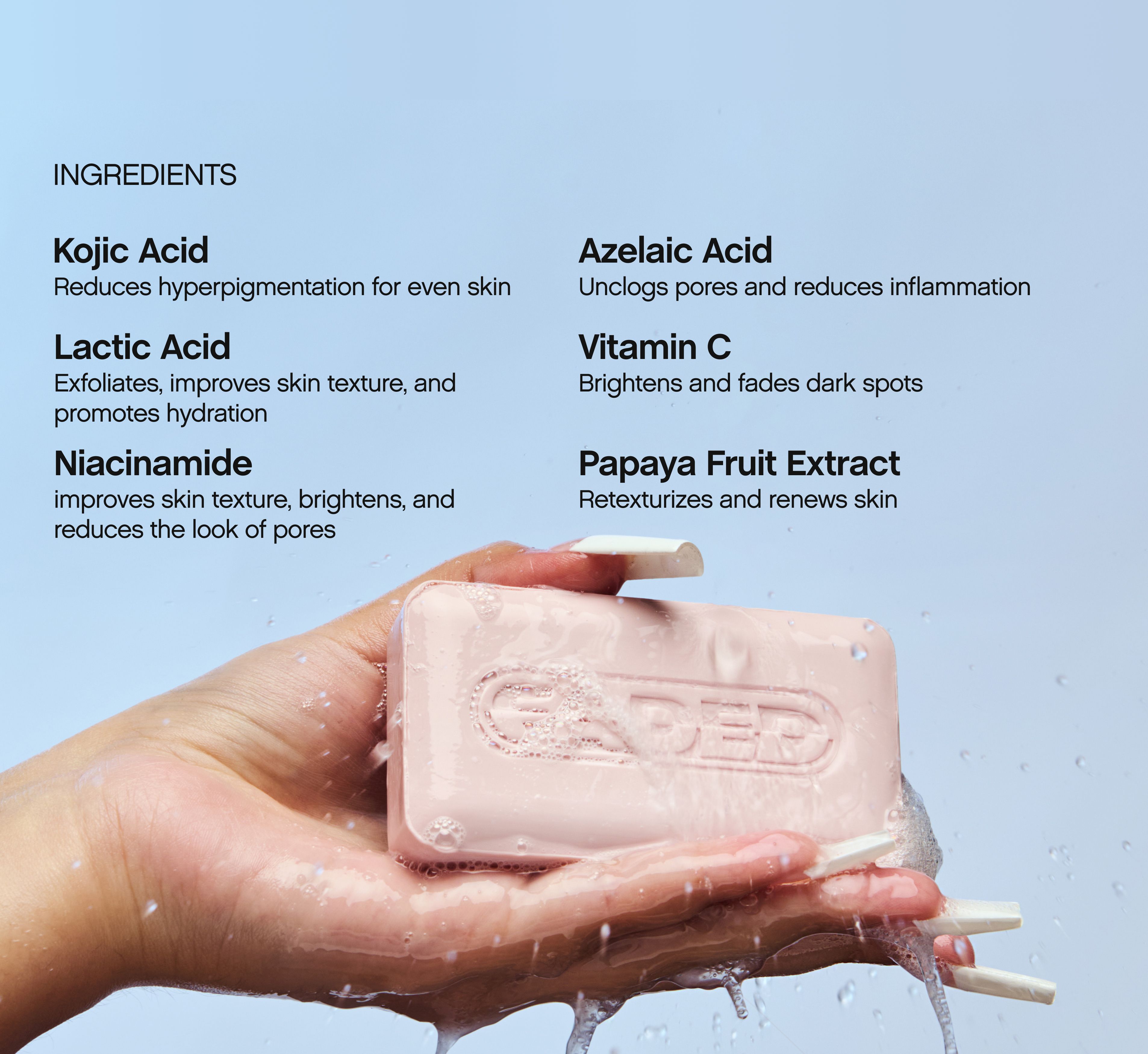 *Results are from 8 weeks of daily use of Faded Brightening + Cleansing Bar. Results may vary based on routine and individual skin.