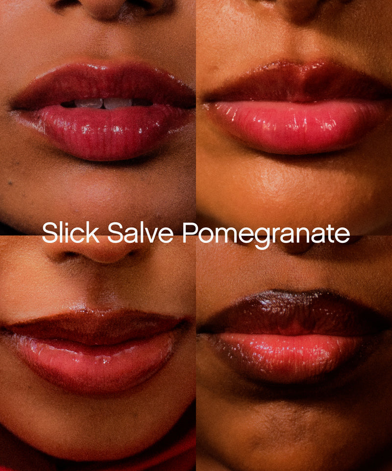 The Slick Salve Trio is a hydrating line-up of our buttery-soft lip balms, including the new sheer cherry red shade "Pomegranate," exclusively available in the kit. All three shades are designed to keep your lips calm, glossy, and juicy.